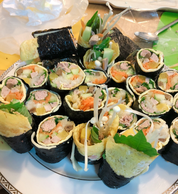 위 재료들을 충분히 익힌 후 김밥을 마는 것도 중요합니다. 일단 밥이 다른 재료랑 붙을 경우 상하는 일이 많기에 속재료와 밥이 최대한 붙지 않게 말아줍니다.