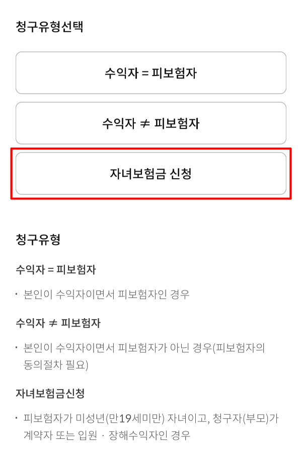 청구유형 선택: 자녀보험금 신청. 만일 미성년자가 아닌 성인이 본인 명의의 보험금을 청구하려면 수익자 = 피보험자 선택하면 됩니다.