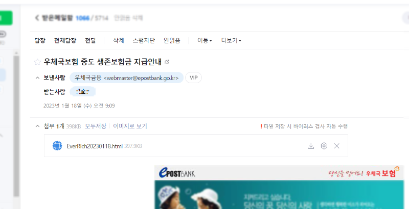 오랜만에 밀린 메일함을 확인하는데 우체국에서 <중도 생존보험금 지급안내>라는 메일을 받았습니다.