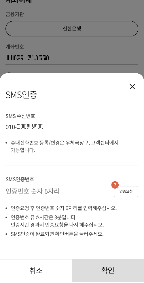 ⑥ 다음으로 ARS인증 또는 SMS인증을 추가로 진행합니다. 저는 SMS인증을 진행했습니다. ⑦번 이미지와 같이 내 고객정보의 핸드폰 번호로 인증 번호를 발송해 인증을 받습니다. 인증 후 확인을 눌러줍니다.