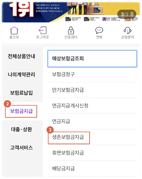 ② 보험금 지급 > ③ 생존보험금지급 메뉴를 순차적으로 누릅니다.