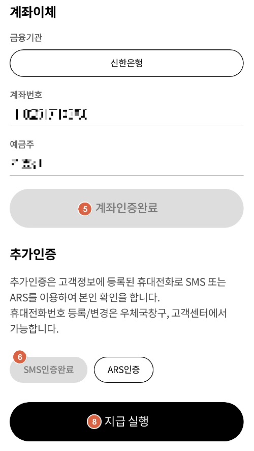⑤ 지급받을 은행 기관명, 계좌번호, 예금주를 기입 후 누르면 유효한 계좌인지 체크합니다.