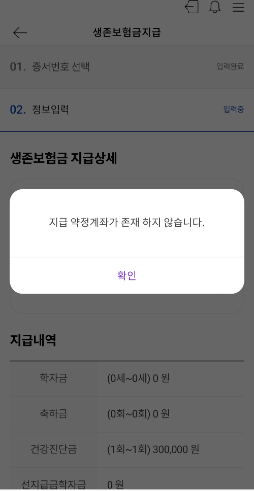 만약 계약 시 환급금 계좌 입력을 하지 않았다면 아래 두번째 이미지와 같이 '지급 약정계좌가 존재 하지 않습니다.'라고 안내됩니다.