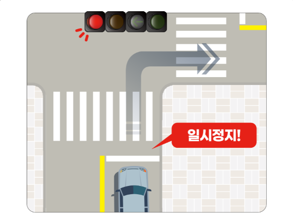 차량 운전자는 전방이든 측면이든 신호등 색이 적색이면 무조건 일시 정지입니다.