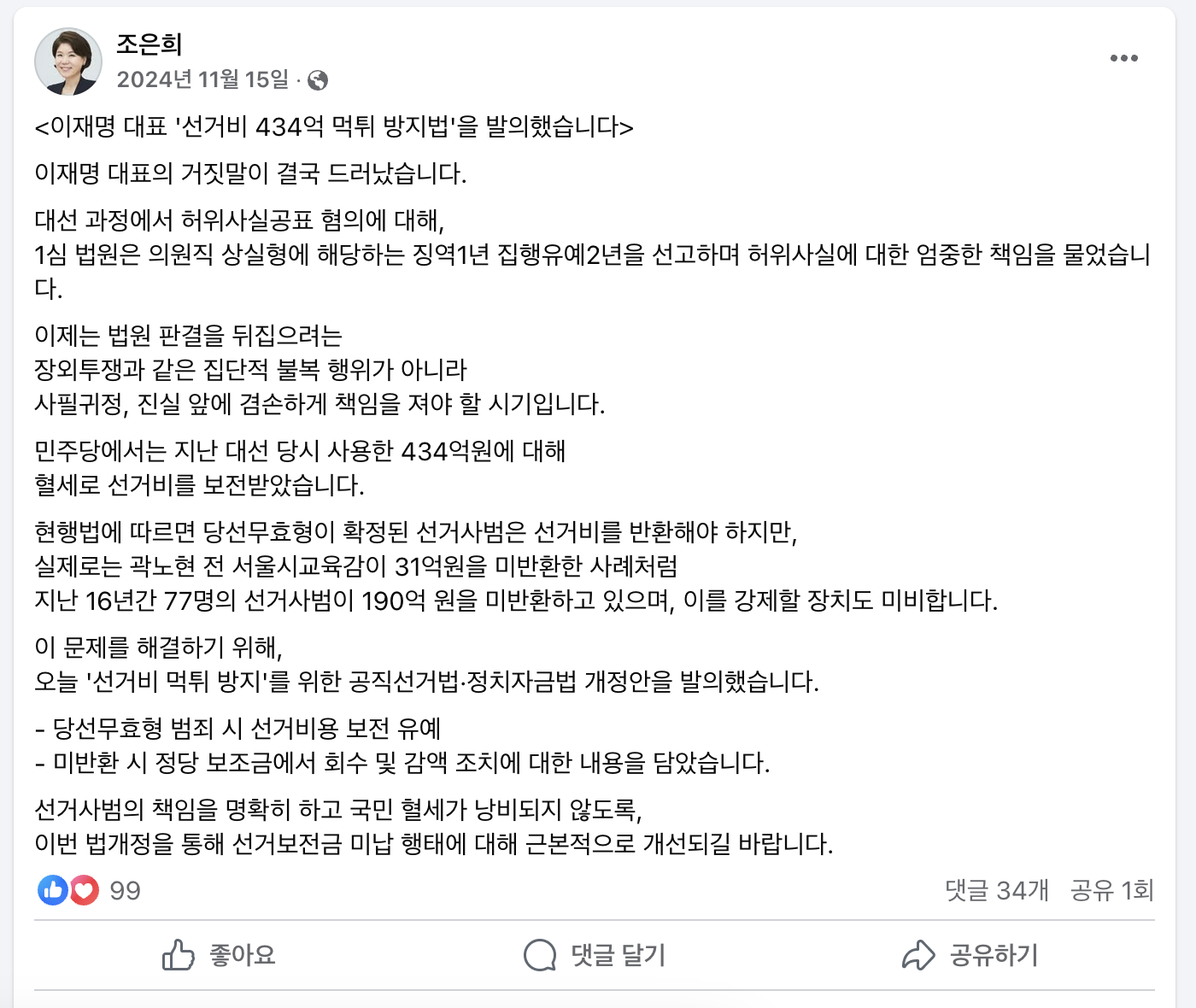 당시 국민의힘은 “선거를 통해 거액의 보조금을 받은 후보가 유죄 판결을 받게 된다면 보조금을 국민 세금으로 먹튀하는 것”이라며 강하게 비판했고, 이를 막기 위해 보조금 반환을 강제하는 입법이 필요하다고 주장했습니다.