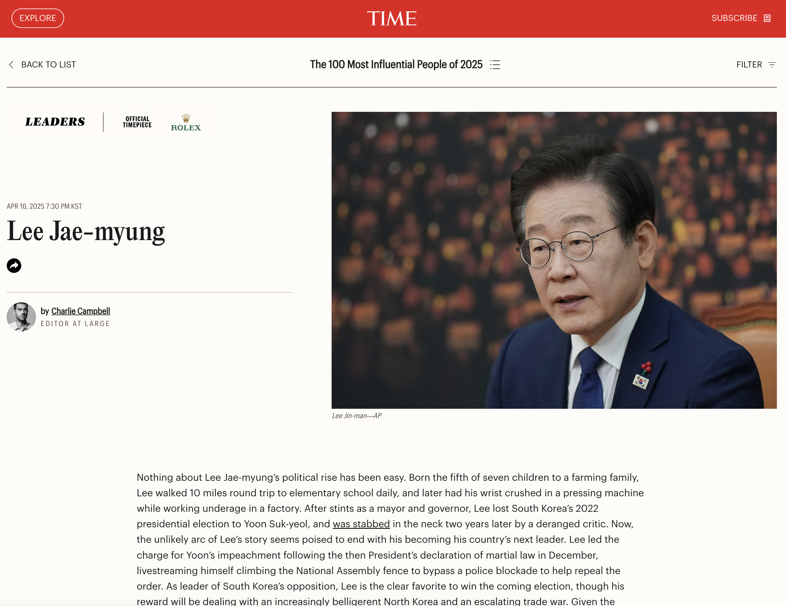 타임은 특히 2024년 국회에서 윤 전 대통령 탄핵을 주도한 사건과, 이후 대선 출마 선언을 통해 다시 한 번 정치 중심으로 부상한 점을 언급했습니다. 타임지는 그를 "정상이 아닌 비판자에게 공격을 당했지만, 다시 일어난 정치인"이라고 표현하며 강한 회복력과 지도력을 강조했습니다.