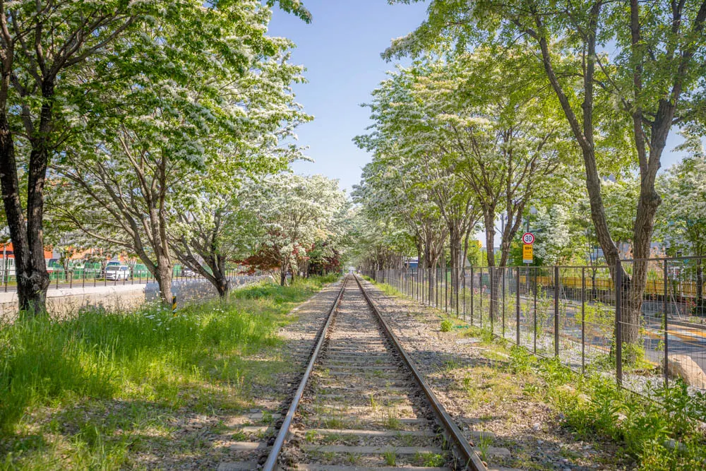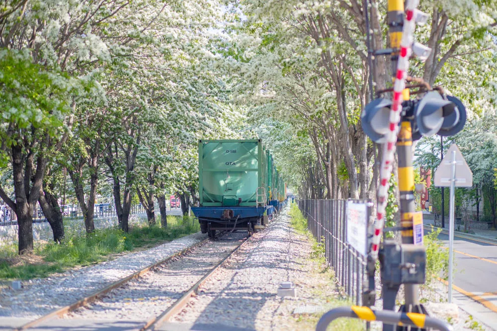 전주 팔복동은 이팝나무와 철길이 어우러진 이색적인 장소로, 개화 시기에는 일부 철길 구간이 안전하게 개방되어 특별한 풍경을 제공합니다. 팔복예술공장 인근에 위치한 이 철길은 실제 화물열차가 지나가는 현역 선로이지만, 이팝나무가 하얗게 만개한 순간에는 기차와 꽃이 함께 어우러지는 진귀한 장면을 만날 수 있습니다.