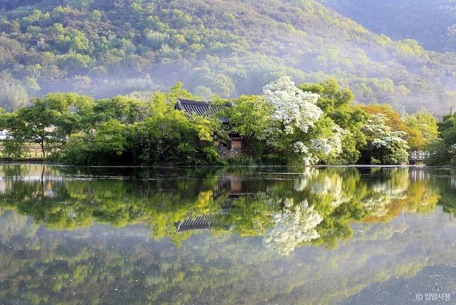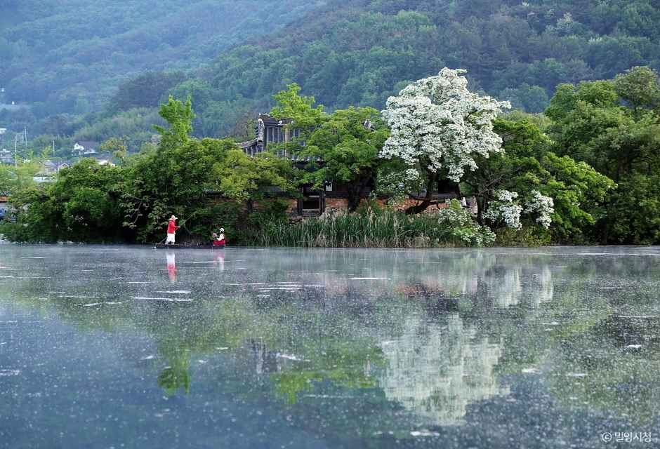 경남 밀양의 위양지는 신라시대 저수지를 품은 정원형 유적지로, ‘백성을 위한 못’이라는 이름처럼 조용하고 편안한 분위기를 자아냅니다. 위양지의 중심에 자리한 정자 ‘완재정’은 이팝나무가 만개한 시기, 하얀 꽃과 붉은 기와가 어우러져 한 폭의 수채화를 그립니다.