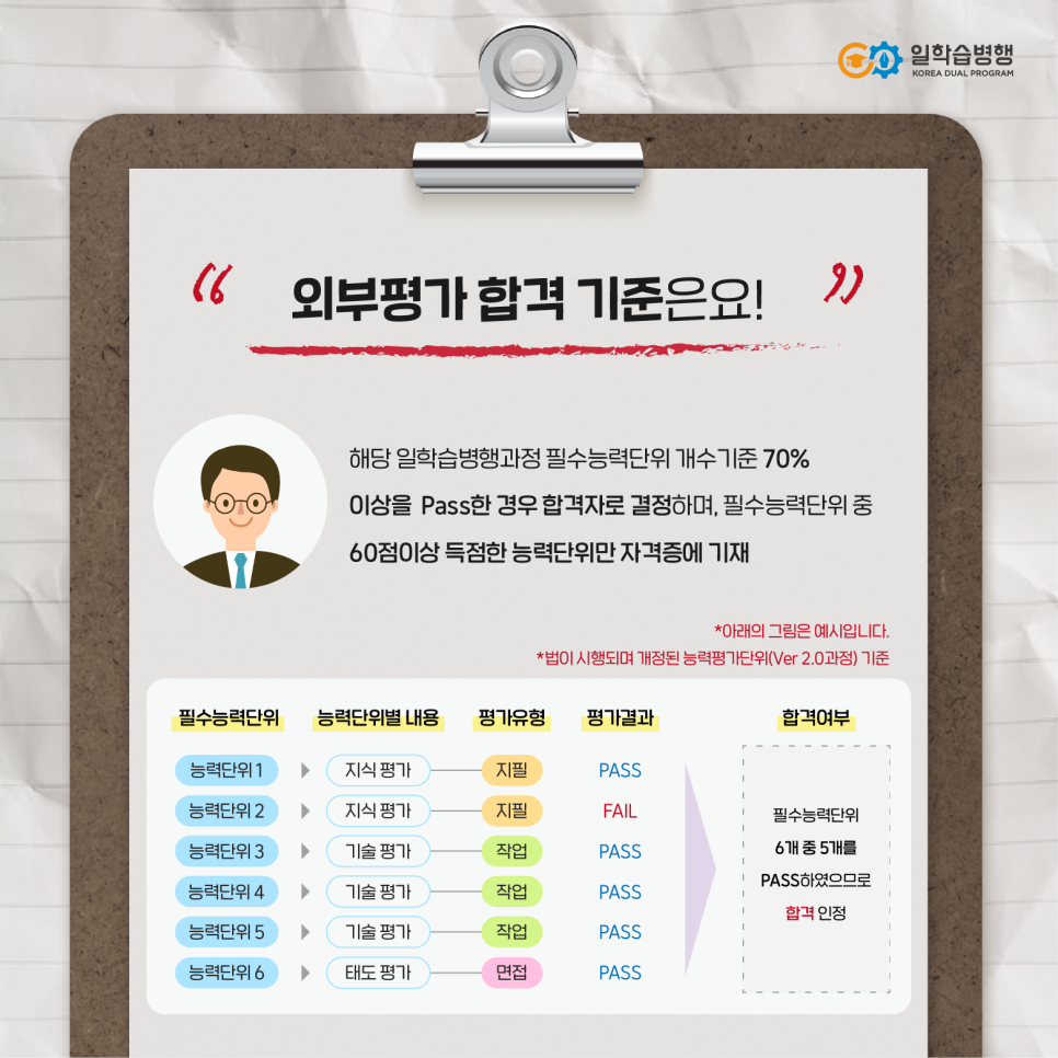 NCS기반자격 필수능력단위 개수 기준의 70% 이상일 경우 외부평가 합격처리됩니다.