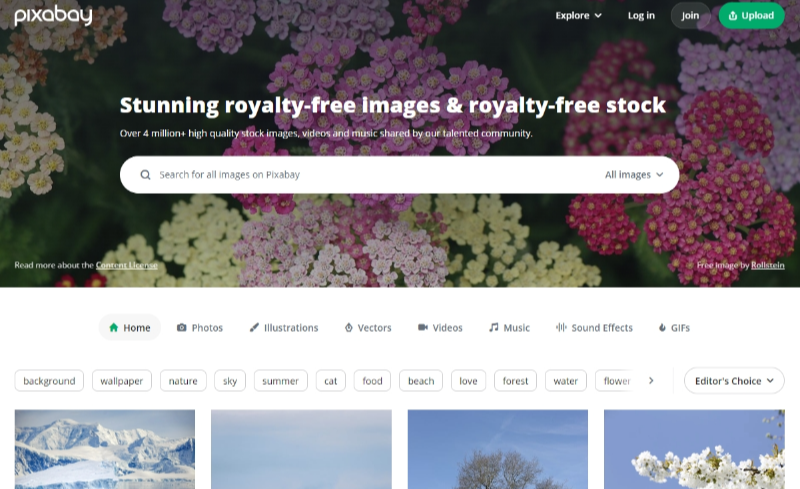 픽사베이는 한국을 비롯해 전 세계적으로 가장 인기가 많은 무료 이미지 사이트 가운데 하나입니다. 400만 개 이상의 고품질 사진, 일러스트, 벡터 이미지, 비디오, 음악, GIF 이미지가 공유되고 있습니다. 2010년 출시를 시작으로 현재는 전 세계 26개국 언어로 서비스되고 있으며 누구나 무료로 가입할 수 있습니다. 저도 가장 자주 사용하는 사이트 중 하나입니다.