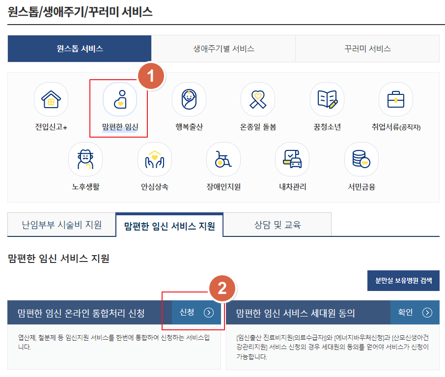 맘편한 임신 서비스 지원 | 원스톱 서비스 | 똑똑한 서비스 | 정부서비스 | 정부24