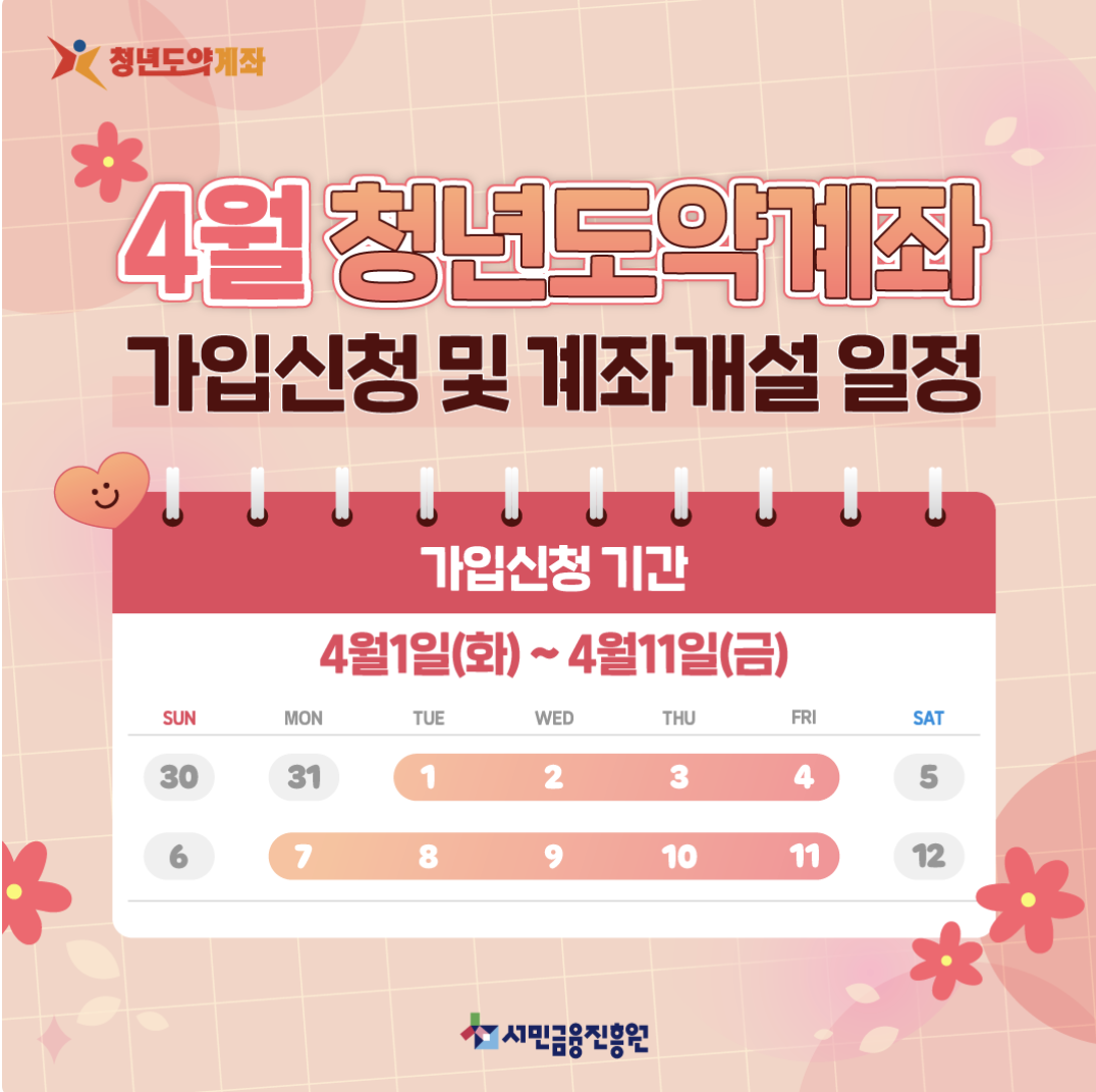 서민금융진흥원이 청년의 자산 형성을 돕기 위한 ‘청년도약계좌’의 4월 가입 일정을 발표했습니다. 오는 4월 1일부터 11일까지, 총 9영업일 동안 신청이 가능합니다.