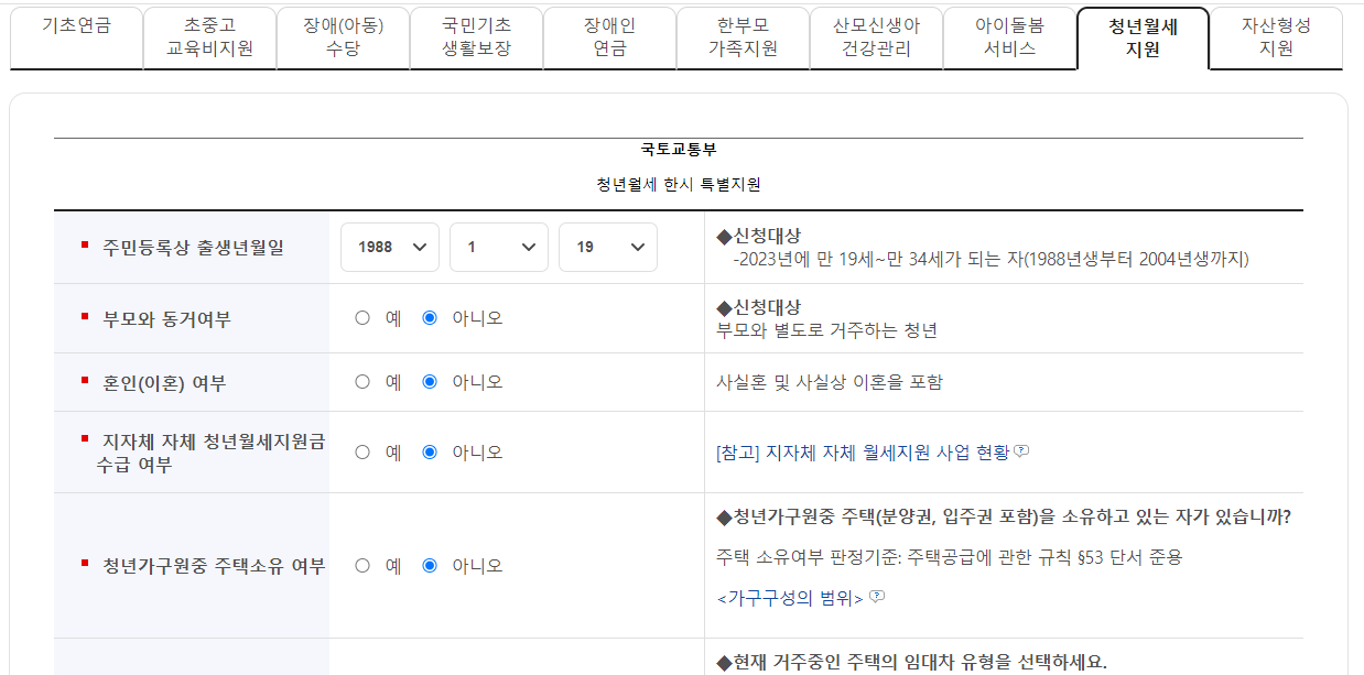 복지로 청년 월세 한시 특별지원 모의 계산