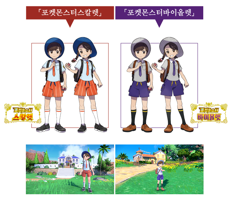 9세대 포켓몬스터가 등장하는 이번 타이틀은 스칼렛버전, 바이올렛 저번 메인 스토리는 동일하지만, 등장하는 주인공/인물의 의상, 등장하는 일부 포켓몬 버전 등이 일부 다릅니다.