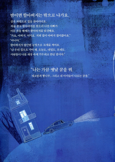 간혹 할아버지 때문에 아빠가 힘들어하거나 주변 사람들이 할아버지에 대해 무섭고 이상하다고 수근거릴 때도 피도는 언제나 똑같이 할아버지를 대합니다. 피도의 눈엔 할아버지는 다른 사람들과 똑같이 잠자고 먹고 숨 쉬지만 조금 다를 뿐입니다. 할아버지가 사과를 베어 물고 감자가 맛있다고 해도, 호두를 던지며 풍뎅이가 날아간다고 해도, 물건을 두고 못 찾아도 피도의 눈엔 그저 할아버지는 할아버지일 뿐입니다.