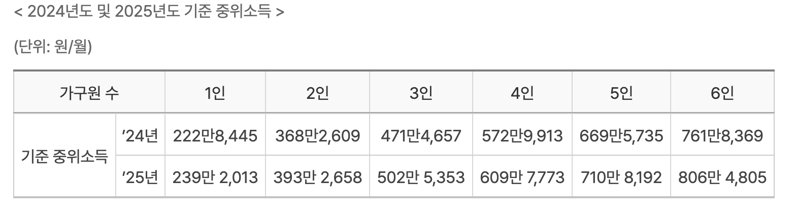 - 소득 기준 (2025년 기준 중위소득 50%)