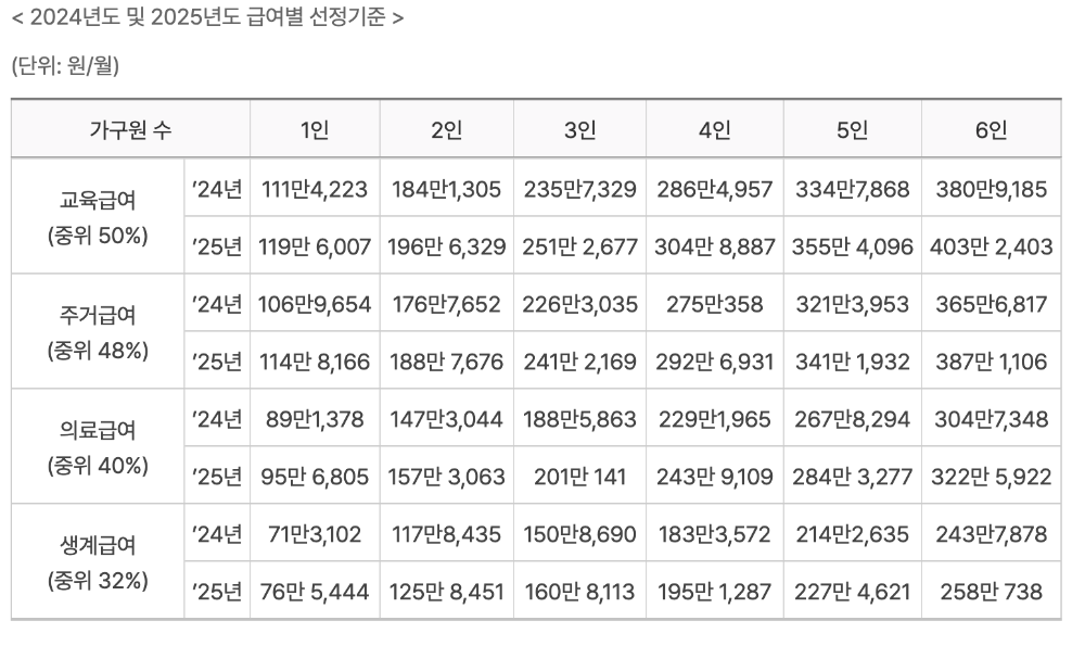 참고로 아래는 2025년도 급여별 선정 기준과 중위소득입니다.