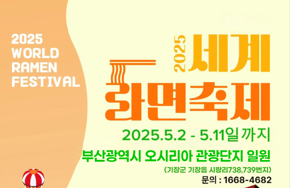해외여행을 떠나지 않아도, 세계 각국의 라면을 한자리에서 즐길 수 있다면 어떨까요? 올해 5월, 부산 기장에서 열리는 ‘2025 세계라면축제’는 단순한 먹거리 행사를 넘어, 글로벌 라면 체험과 AI 기반 무대, 그리고 환경을 생각한 운영까지 겸비한 이색 축제로 기대를 모으고 있습니다. 봄 나들이로도 제격인 이번 행사는 라면을 좋아하는 사람이라면 놓칠 수 없는 기회입니다.